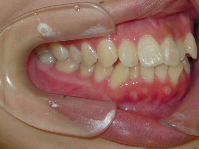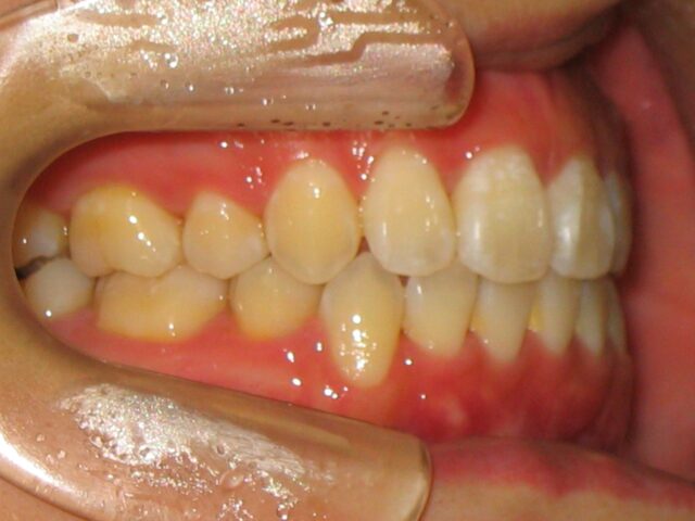 唇側矯正 歯を抜いて口元を後退させた治療例 この治療例は上下顎左右第一小臼歯を抜歯して、上下顎前歯を後退させた写真です。 治療前 治療中 治療後 主訴 口元の前突を治したい 診断名あるいは主な症状 上下顎前突 年齢 25才 治療に用いた主な装置 唇側矯正装置 抜歯部位 上下顎左右第一小臼歯 治療期間 約2年 治療費概算 880,000円(税込) リスクと副作用 歯の数が少なくなる。矯正治療後、抜歯した部位に隙間が空きやすい。歯磨きが悪いと唇側の歯肉炎、虫歯を起こしやすい。