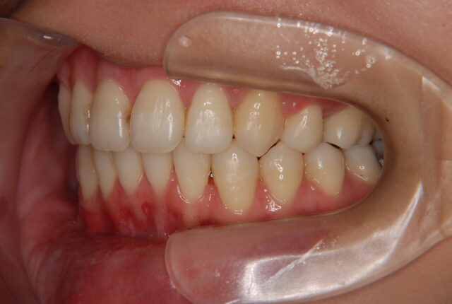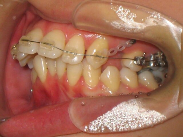 唇側矯正 歯科矯正用アンカースクリューを用いた矯正治療 顎骨に矯正用のインプラントを植立して、歯牙を索引、移動させるための固定源にします。短期間に植立可能ですが、脱落しやすいものでもあります。 治療前 治療中 治療後 主訴 出っ歯を治したい 診断名あるいは主な症状 上顎前突 年齢 28才 治療に用いた主な装置 歯科矯正用アンカースクリュー、唇側矯正装置 抜歯部位 上顎左右第一小臼歯 治療期間 約2年 治療費概算 880,000円(税込) リスクと副作用 アンカースクリュー周辺の清掃を怠ると、歯肉炎を起こしたり、脱落の可能性がある。植立時に破折、歯根の損傷リスクがある。