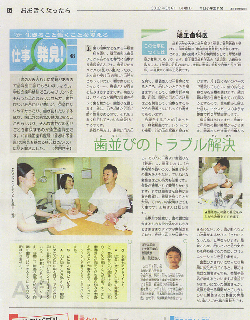 2012年3月6日発行の毎日小学生新聞に当医院が掲載されました。 「仕事発見!」という色々な仕事を紹介する特集内で矯正歯科医の仕事を紹介するということで取材を受けました。