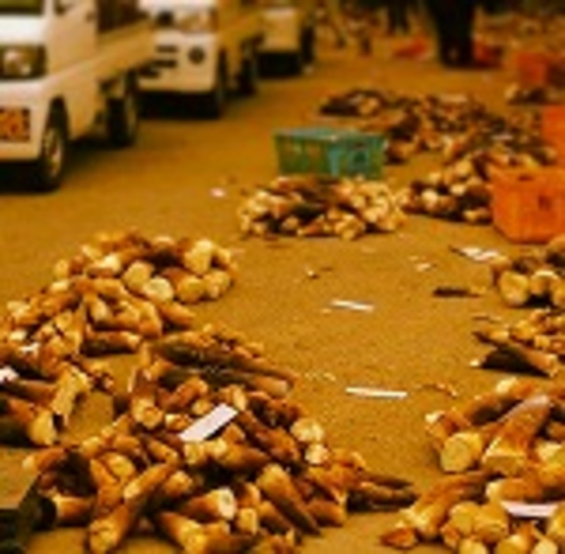 写真は去年の筍卸売市場の様子ですが、これはお昼なので朝にはもっと山積みになっています。